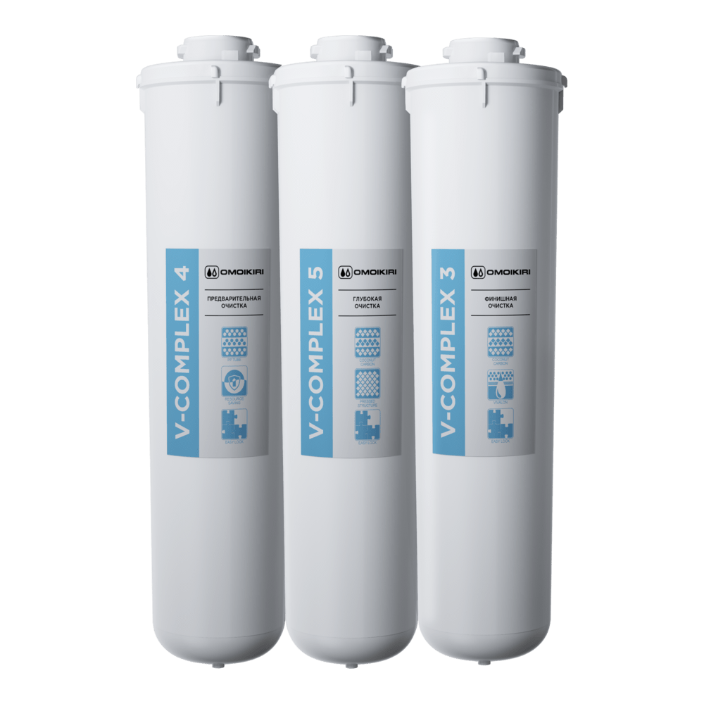 V-Complex 4. Предварительная очистка. Неразборный сменный модуль с полипропиленовым картриджем внутри. Эффективно используется для воды с высоким содержанием механический примесей, позволяет продлить жизнь основным сорбционным модулям. V-Complex 5. Глубокая очистка. Изготовлен по технологии карбонблок с волокном с использованием мелкодисперсного активированного кокосового угля. Благодаря плотной структуре эффективно удаляет из воды органические примеси и активный хлор. Отфильтровывает частицы размером до 3 микрон. Ионообменные нити Vivalon с модифицированными селективными хелатными группами глубоко и необратимо очищает воду от тяжёлых металлов. Содержит серебро в активной ионной форме. V-Complex 3. Окончательная очистка. Сверхплотный карбонблок с волокном, изготовленный из порошкообразного активированного кокосового угля. Удаляет остаточные концентрации органических примесей и тяжёлых металлов. Отфильтровывает частицы размером до 0,8 микрон. Модифицированные нити Vivalon распределяет потоки воды в сверхплотной фильтрующей среде для достижения наилучшей очистки. Содержит серебро в активной ионной форме.