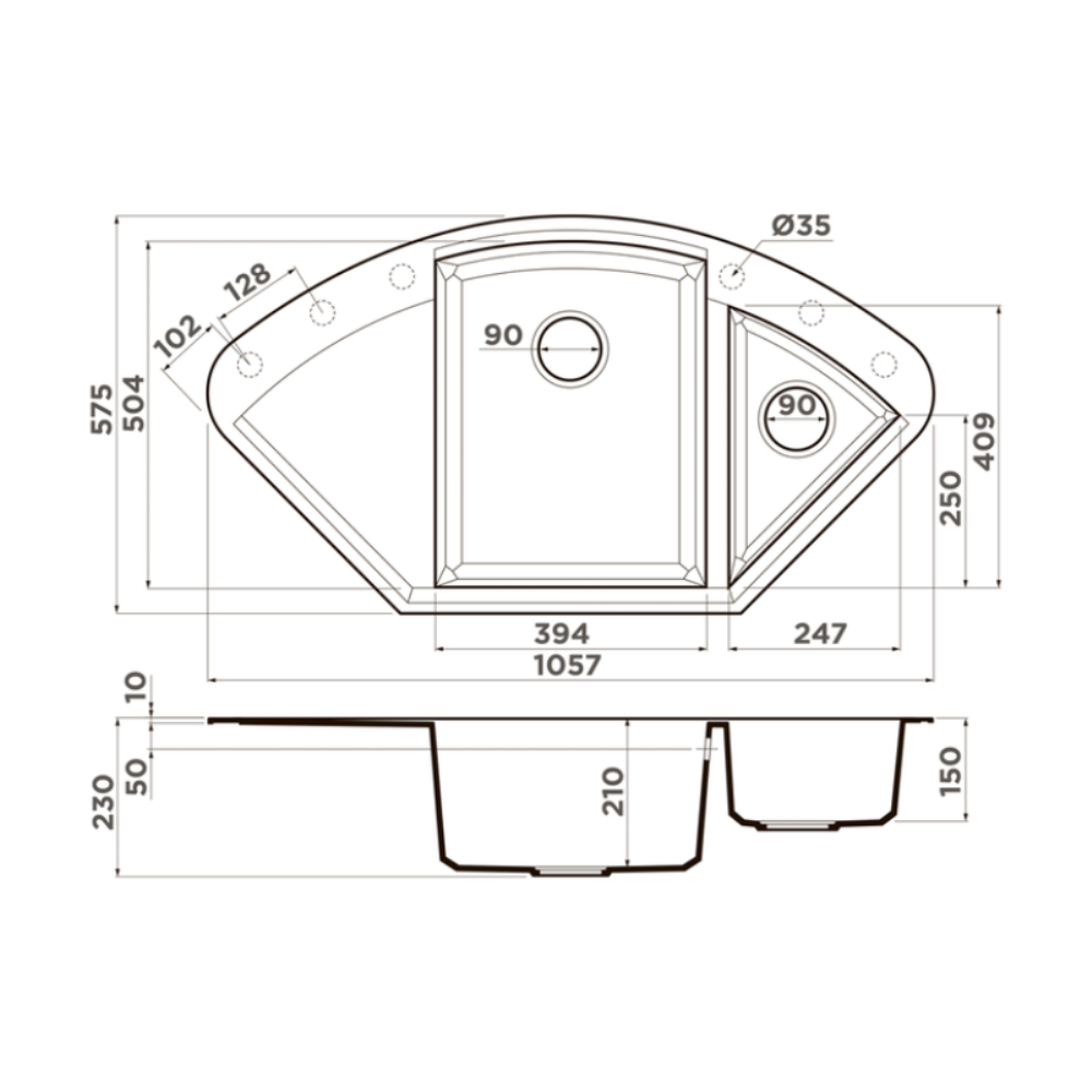 Мойка кухонная Omoikiri из коллекции Sakaime 105C-DC имеет размеры 1057х575 мм., изготовлена из искусственного гранита. Форма — угловая, одна чаша без отверстия для смесителя. Сифон в комплекте. Ширина чаши 39,4. Врезной монтаж. Имеется дополнительная чаша и крыло.