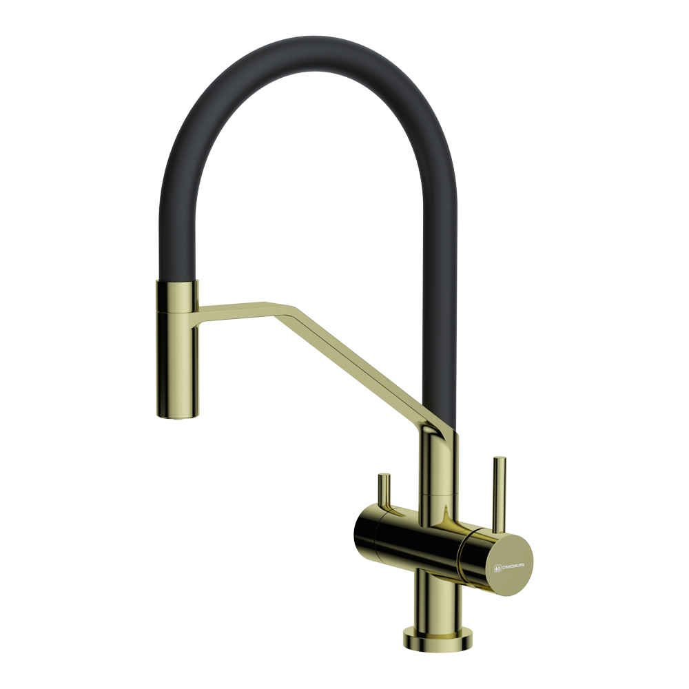 Смеситель для кухни Omoikiri Akeno с подключением фильтра оснащен рычажным управлением для регулировки температуры и напора воды. Горизонтальный монтаж на 1 отверстие. Гибкий излив 230 мм.