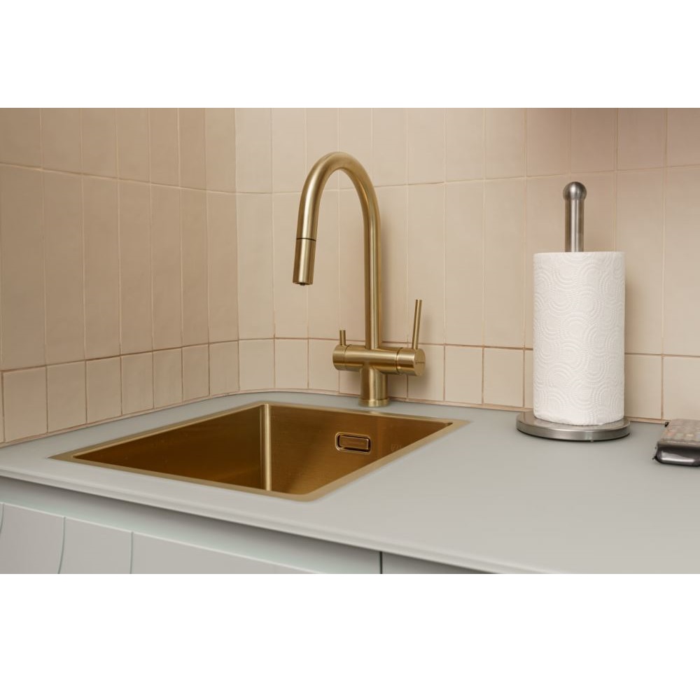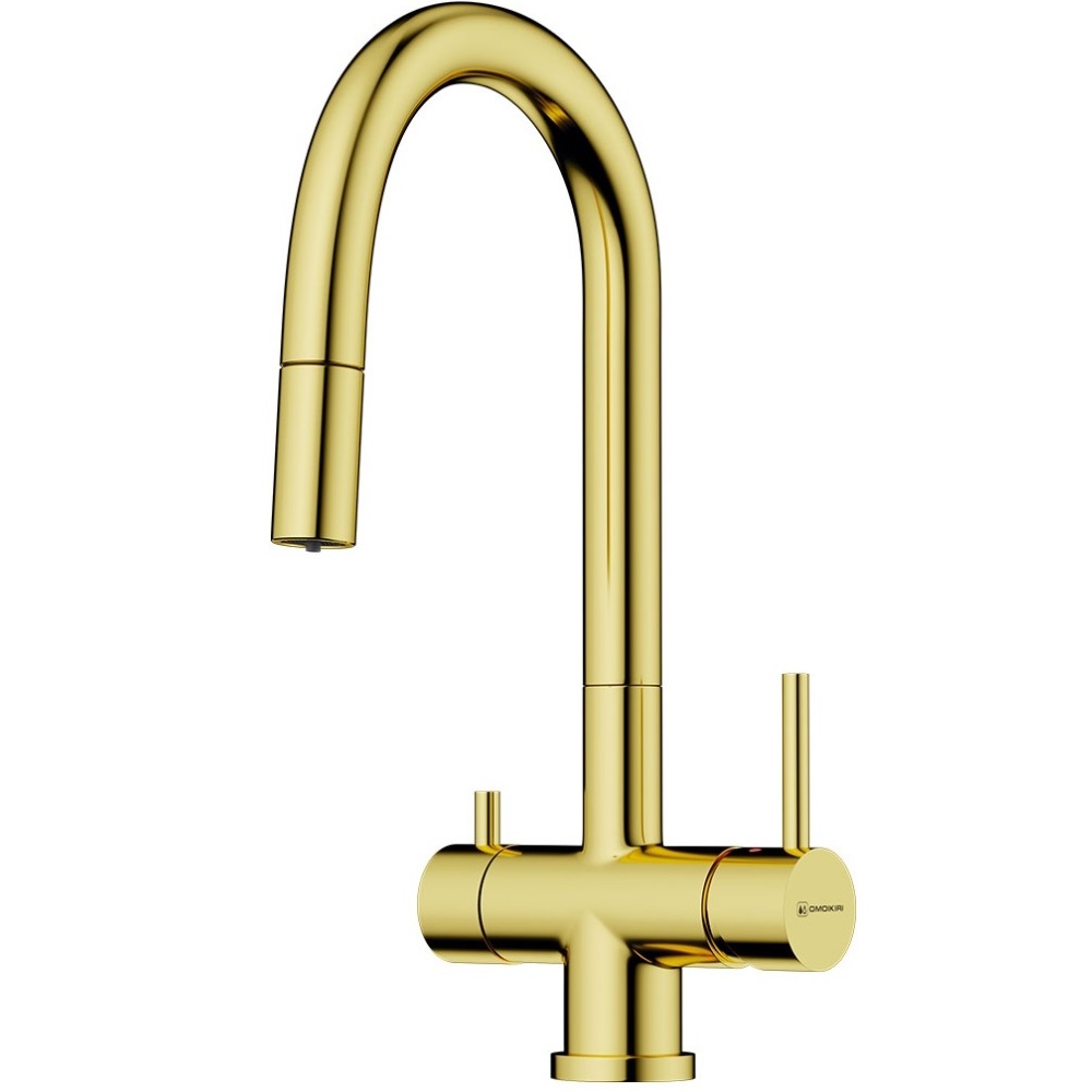 Смеситель для кухни Omoikiri Akita-S с подключением фильтра и выдвижной излив оснащен рычажным управлением для регулировки температуры и напора воды. Горизонтальный монтаж на 1 отверстие. Поворотный излив 215 мм.