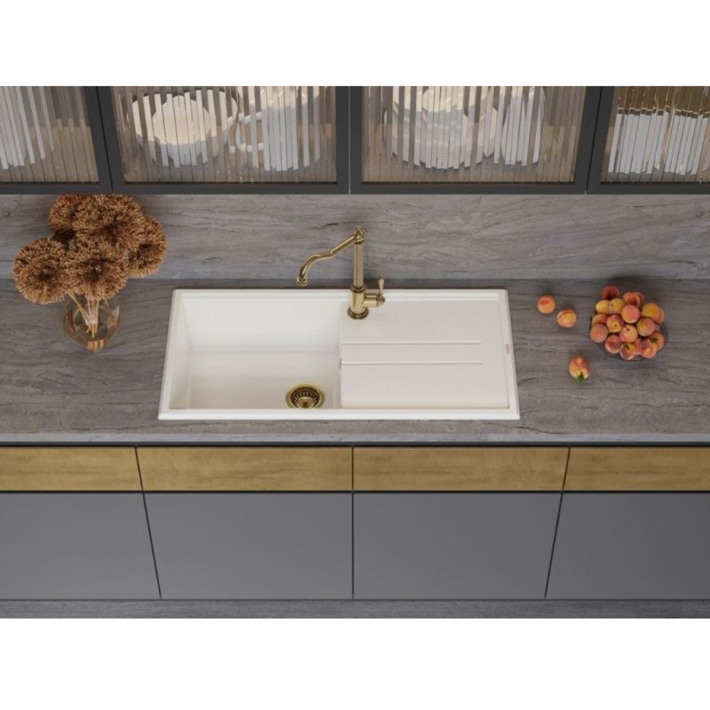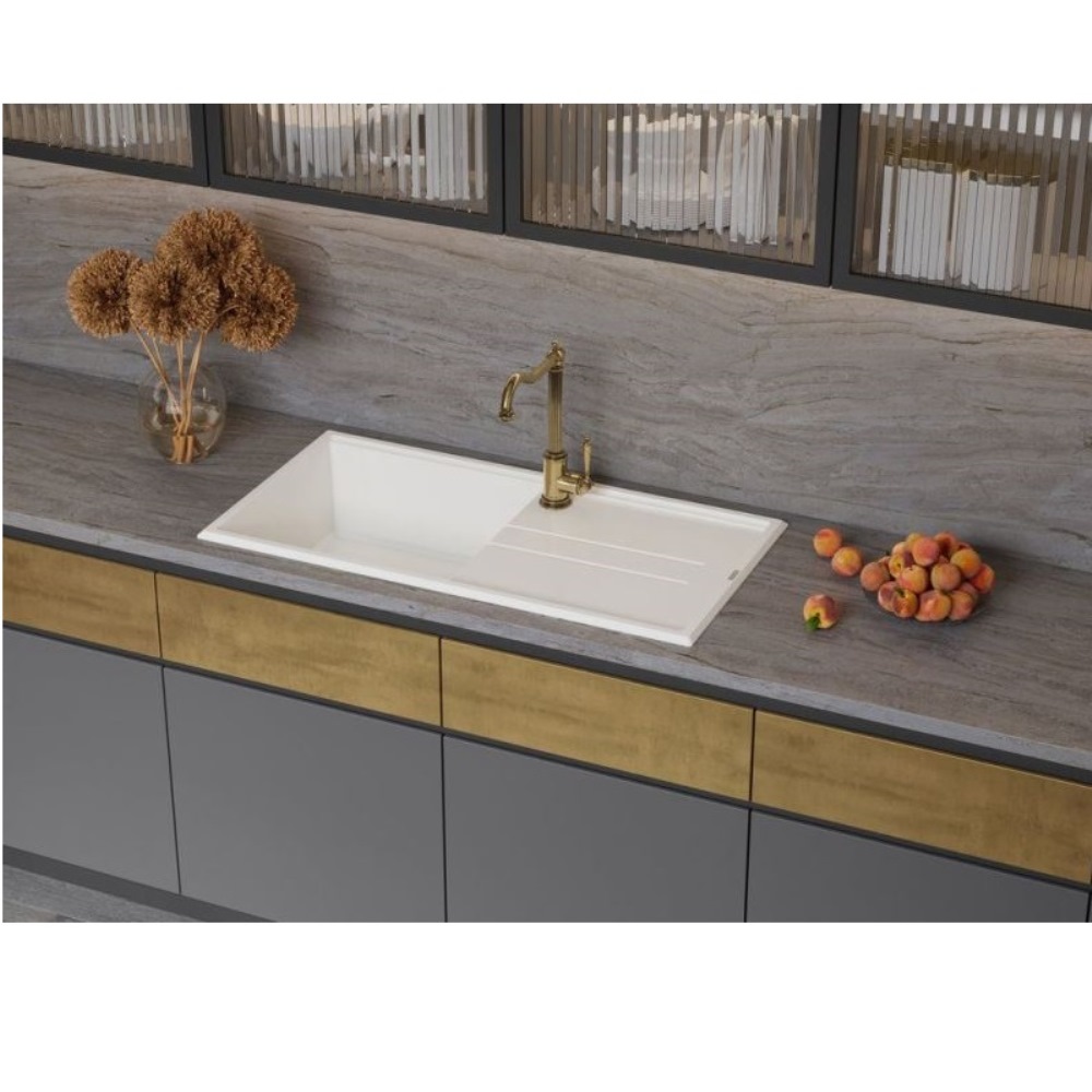 Мойка кухонная Omoikiri из коллекции Tedori 100-WH имеет размеры 1000х510 мм., изготовлена из искусственного гранита. Форма — прямоугольная, одна чаша без отверстия для смесителя. Сифон в комплекте. Ширина чаши 47,8. Врезной монтаж. Имеется крыло.