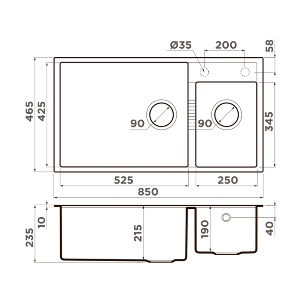 Мойка кухонная Omoikiri из коллекции Tedori 85-2-U-ES имеет размеры 850х465 мм., изготовлена из искусственного гранита. Форма — прямоугольная, одна чаша без отверстия для смесителя. Сифон в комплекте. Ширина чаши 52,5. Подстольный монтаж. Имеется дополнительная чаша.