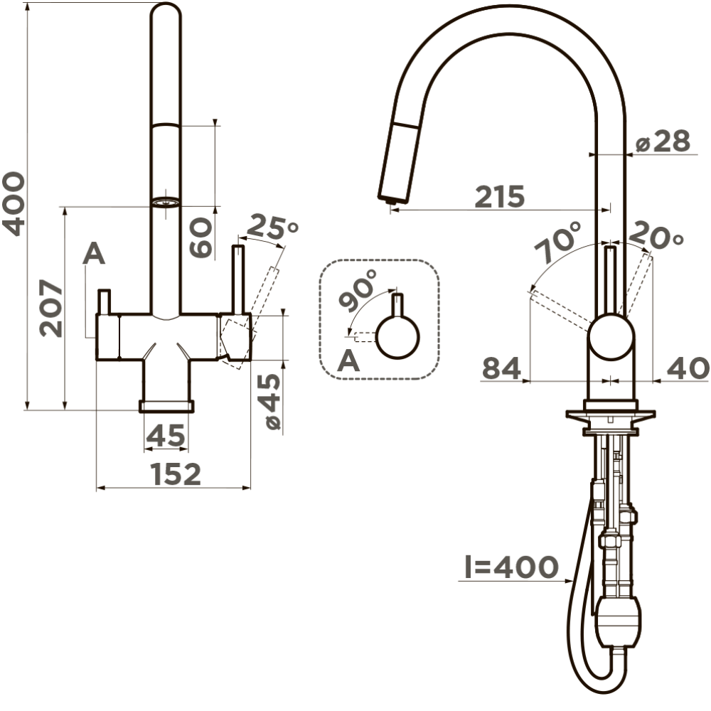 Смеситель для кухни Omoikiri Akita-S с подключением фильтра и выдвижной излив оснащен рычажным управлением для регулировки температуры и напора воды. Горизонтальный монтаж на 1 отверстие. Поворотный излив 215 мм.
