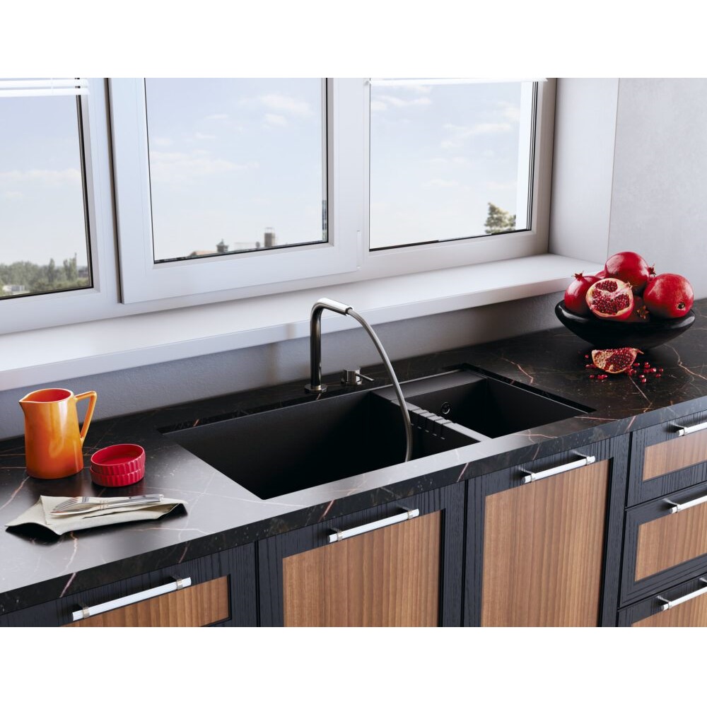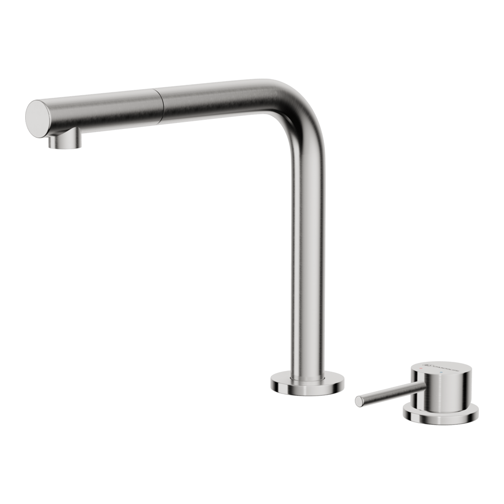 Смеситель для кухни Omoikiri Nara-S оснащен рычажным управлением для регулировки температуры и напора воды. Горизонтальный монтаж на 2 отверстия. Вытяжной излив 220 мм.